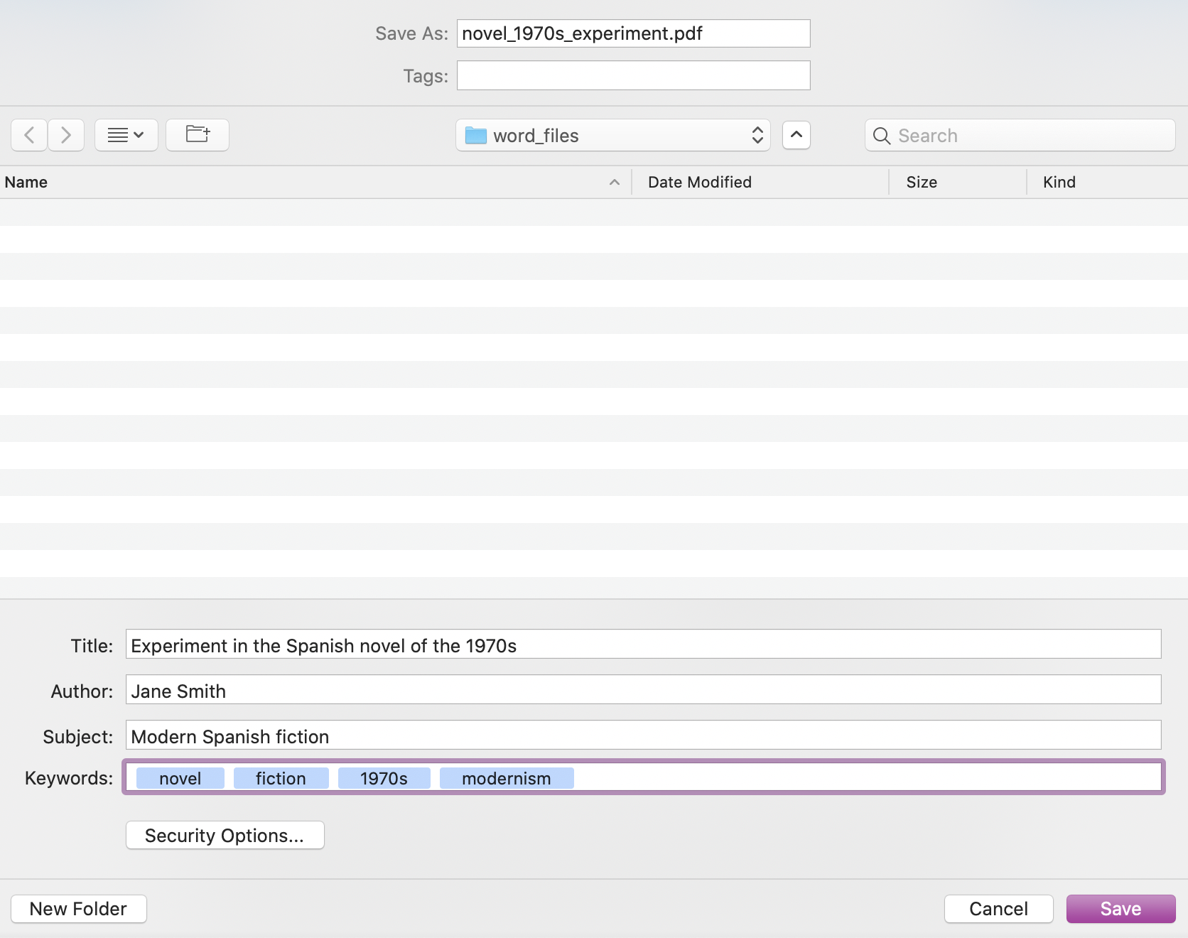 You can save the file under an appropriate name (preferably not essay.pdf so as to ensure the work in question can be clearly identified at a later date). Note that you can incorporate metadata into the PDF file by completing the boxes in the lower part of the screen.